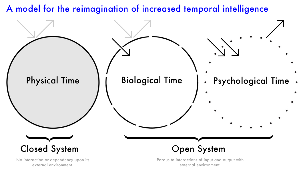 If we now view these three states of time as systems (a set of things working together as parts of a interconnecting network) we begin to expose the seismic shift in our sense of time that standard time has brought about. Considering time as a system we can begin to appreciate the current view of time contained within Physical Time as a closed system — in comparison to biological and physical time which both exist as open systems. Indeed, it has been the ability of standard time to holistically isolate itself from all external influences which has facilitated its ability to become THE universal measure of time. The clock of standard time ticks on entirely regardless of its environment.